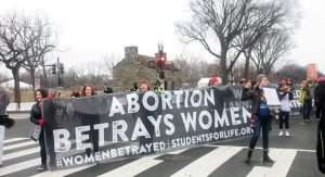 The protesters shoved their way in to be right in front of the speakers and were screaming at us so loud that you couldn’t hear the rally speakers. They were chanting “Prolife men have got to go, if you’re pregnant let us know” and “free abortions on demand and without apology” and “my body, my choice.”