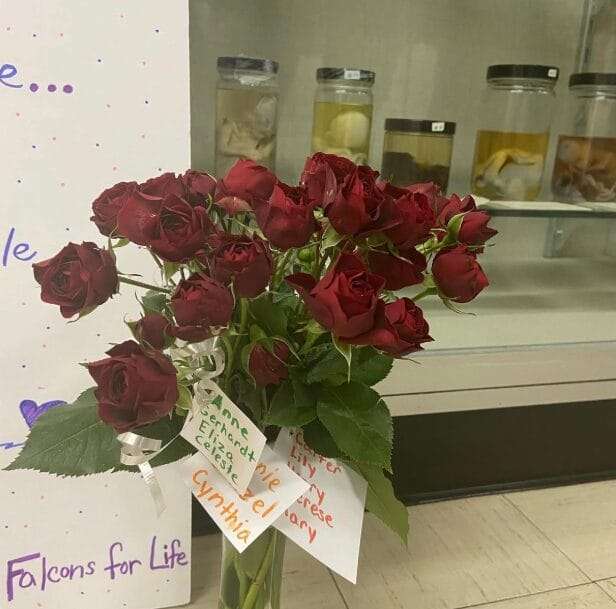 Our group members also took the time to name each of the 30 children. We purchased a bouquet of roses, attached name tags with the babies’ names, and brought them to the glass display case on the 5th floor of the Life Sciences building. There, we prayed, sang, and gave short speeches honoring the dignity of human Life while holding the roses.