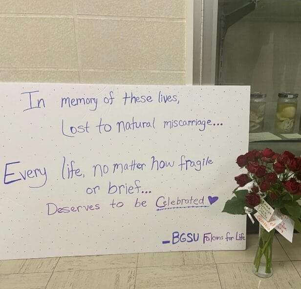 “In memory of these lives, lost to natural miscarriage… Every life, no matter how fragile or brief… Deserves to be celebrated — BGSU Falcons for Life.”